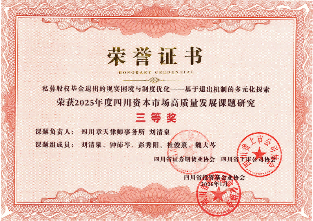 近日,四川省证券期货业协会、四川省上市公司协会、四川省投资基金业协会联合发布了2025年度四川资本市场高质量发展课题研究评审结果。章天律所创始合伙人刘清泉主任牵头的课题《私募股权基金退出的现实困境与制度优化 —— 基于退出机制的多元化探索》经过层层评审,最终荣获三等奖。